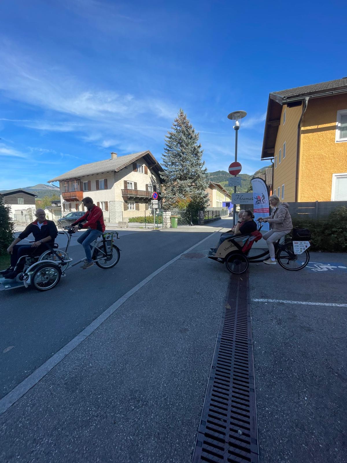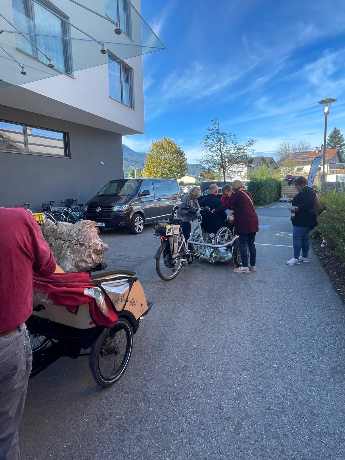 Nach der Begrüßung durch die Hausherrin Andrea Zenzmaier stellte Elke Radeln ohne Alter vor und gab einen kurzen Rück- und Ausblick. Stefan Wallinger, Fahrradhändler aus dem Nachbarort, war ebenfalls vor Ort und berichtete News aus der Fahrradbranche, insbesondere von Trio und den geplanten Verbesserungen der Trio-Rikscha. Aus Mattighofen brachten sie die Van Raam Velo Plus Rollstuhl-Rikscha mit. Das Rollstuhlrad stieß auf großes Interesse, eifrig wurde Probegefahren.