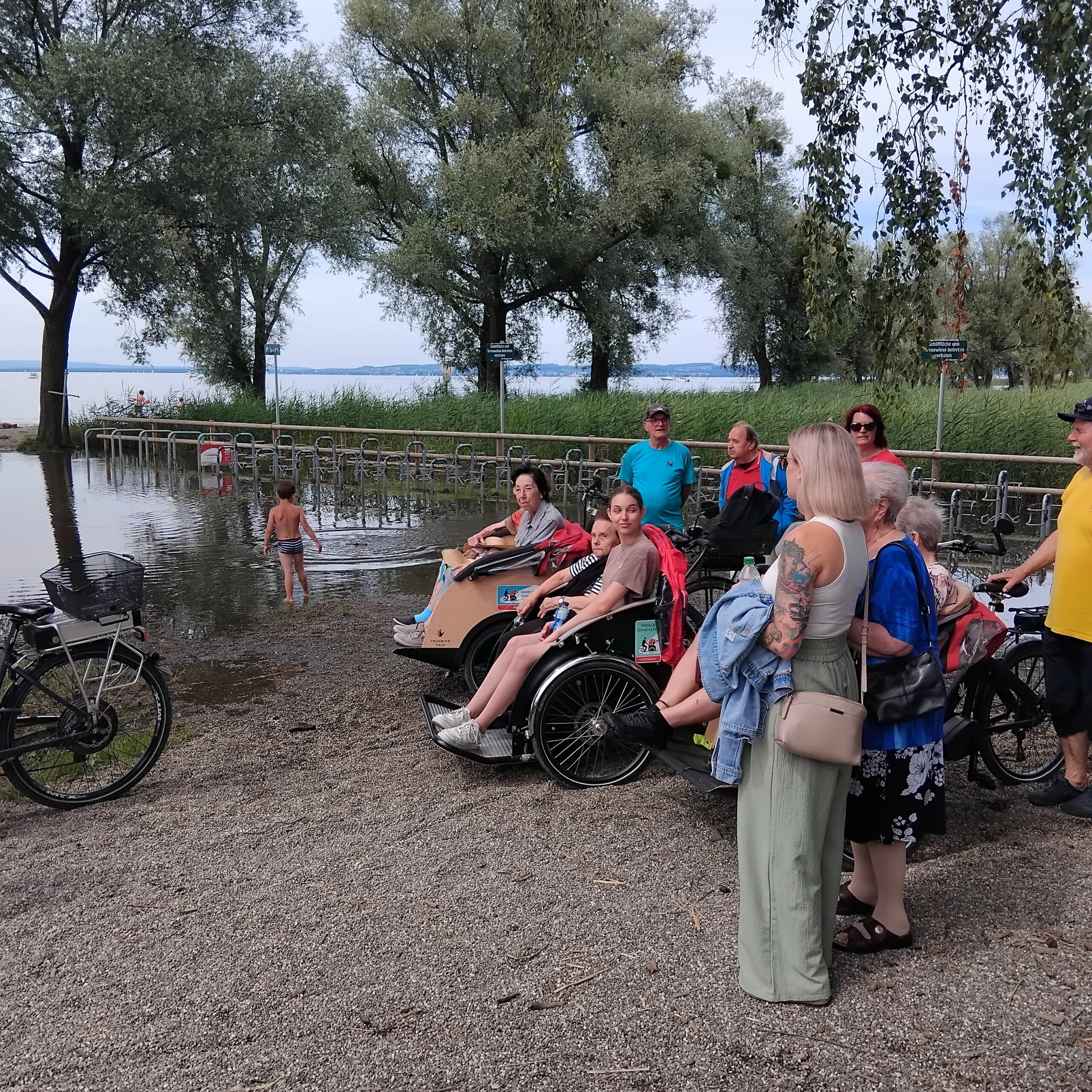 Am Seeufer angekommen staunten alle über den hohen Wasserpegel. „Momentan ist der See um 1, 30 Meter höher als vor einem Jahr.“, erzählte Peter, einer der ehrenamtlichen Rikschafahrer von Radeln ohne Alter im Rheindelta.