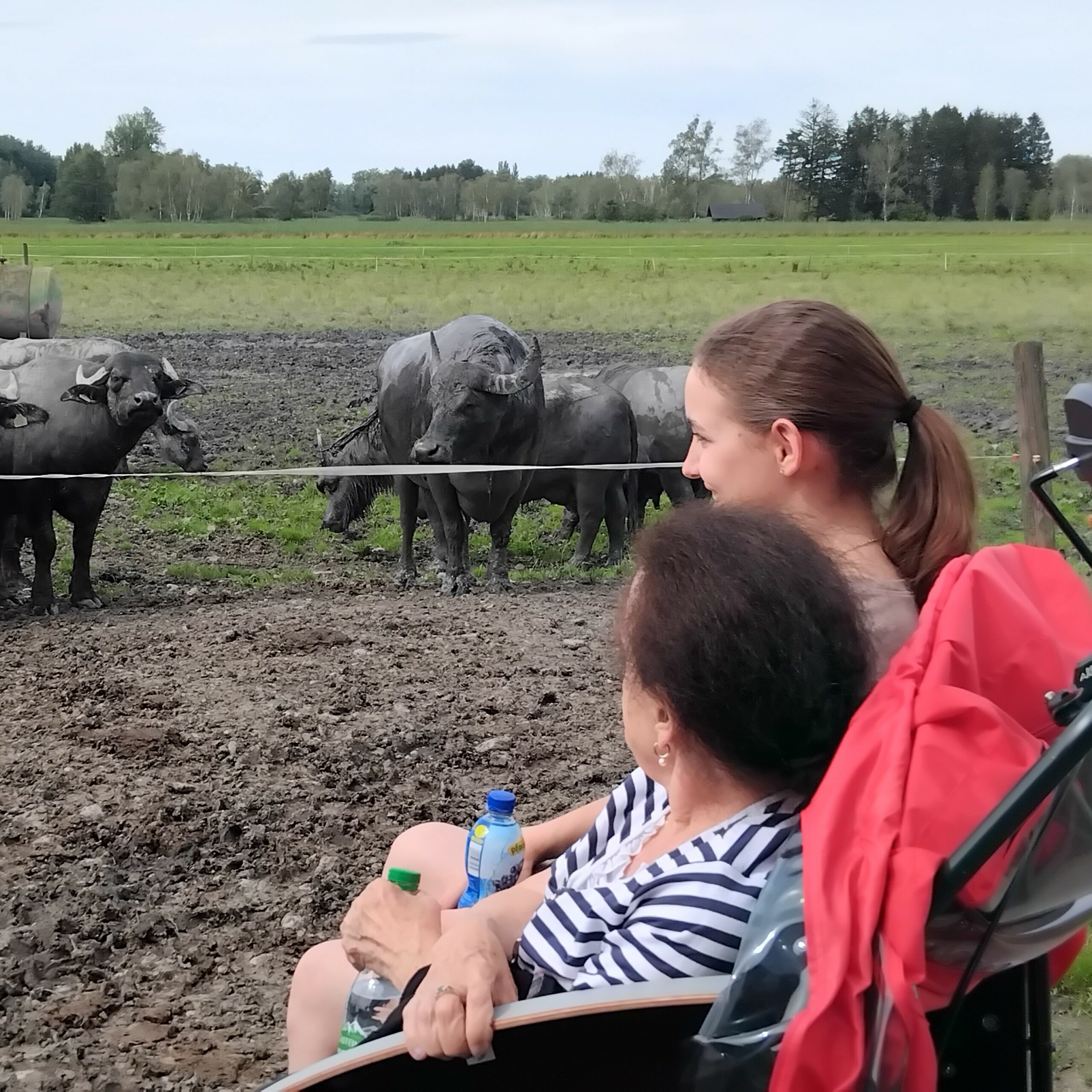 Auf dem Rückweg erregten die großen schwarzen Wasserbüffel die Aufmerksamkeit der Radausflügler:innen. Spontan kehrte die Gruppe beim Heldernhof zu und sagte den Wasserbüffeln Guten Tag. Auch der Bauer freute sich über die außergewöhnliche Radlergruppe, erzählte von den Büffeln, der eigenen Hofsennerei wo tagtäglich frischer Büffelmozzarella hergestellt wird, und brachte Eis zum Verkosten. Die Büffelkälble schauten neugierig aus dem Stall, der Hofhund und die Katze holten sich Streicheleinheiten von den entzückten Seniorinnen und Senioren ab.